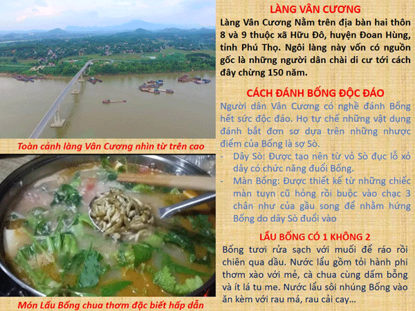 Đến với ngôi làng nhỏ bé Vân Cương thuộc xứ Bưởi Đoan Hùng vào mùa này, du khách sẽ có cơ hội trải nghiệm nghề đánh Bống trên sông Lô đầy thú vị hơn nữa sẽ được thưởng thức vị chua thơm nồng nàn của Lẩu Bống đặc biệt. Theo tìm hiểu của phóng viên vanhien.vn, hiện nay, Nhà hàng Thành Trung Legend (Tổ 11 Gia Tân, Thị trấn Quang Minh, Mê Linh, Hà Nội) là nơi duy nhất đưa món Lẩu Bống truyền thống của người dân Vân Cương vào thực đơn của mình. Tuy nhiên, theo quản lý của nhà hàng này chia sẻ thì lượng Bống sông Lô khá dồi dào nhưng không ổn định nên để có những chú Bống tươi để chế biến món Lẩu Bống thú vị này thì phải đặt trước ít nhất là hai ngày.