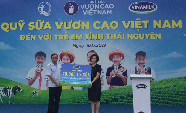 Thực hiện sứ mệnh “Để mỗi trẻ em đều được uống sữa mỗi ngày” và góp phần cải thiện tình trạng dinh dưỡng của trẻ em tỉnh Thái Nguyên, đặc biệt đem niềm vui uống sữa đến cho trẻ em nghèo, Quỹ sữa Vươn Cao Việt Nam và Vinamilk đã trao tặng 70.000 ly sữa tương đương 470 triệu đồng cho 780 em học sinh có hoàn cảnh khó khăn với mong muốn các em sẽ có cơ hội phát triển tốt hơn cả về thể chất và trí tuệ, vươn lên trong học tập.