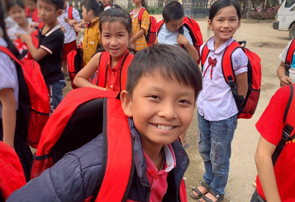 Nụ cười tươi rói của em nhỏ trường Tiểu học Văn Hóa khi được đeo cặp mới đến trường.