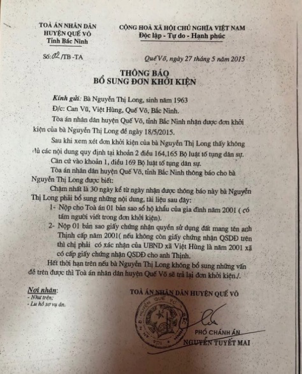 Đồng thời, bà Nguyễn Thị Long có đơn khởi kiện yêu cầu TAND huyện Quế Võ giải quyết chia tài sản theo đúng quy định của Luật thi hành án. Ngày 27/5/2015, Tòa án nhân dân huyện Quế Võ có thông báo số 02/TB-TA thông báo cho bà Long sửa đổi, bổ sung đơn khởi kiện. Bà Nguyễn Thị Long đã thực hiện sửa đổi, bổ sung đơn khởi kiện thoe đúng yêu cầu của Tòa án nhân dân huyện Quế Võ.