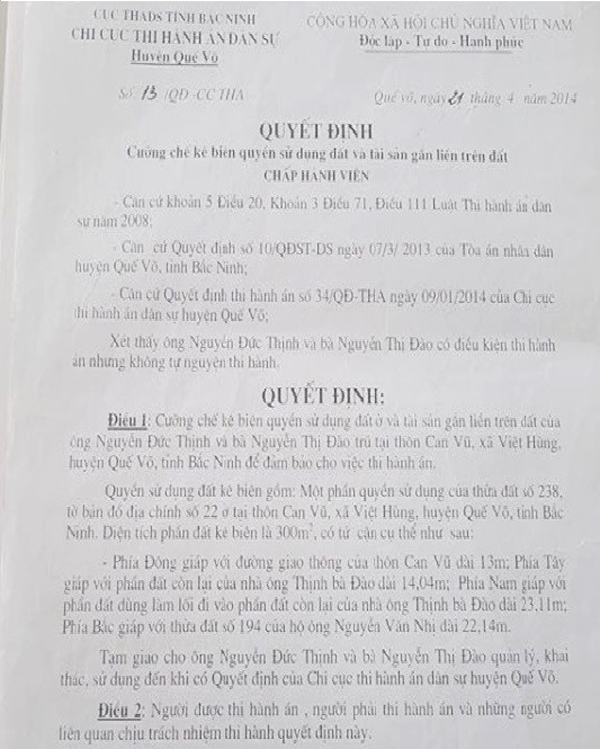 Theo bà Phượng việc chấp hành bản án số 10/QĐST-DS ngày 07/3/2013 của Tòa án nhân dân huyện Quế Võ là nghĩa vụ riêng của ông Nguyễn Đức Thịnh và bà Nguyễn Thị Đào chứ không phải của các thành viên trong gia đình. Mảnh đất số 238, tờ bản đồ số 22, diện tích 624m2 tại thôn Can Vũ, xã Việt Hùng, huyện Quế Võ là của 8 người. Việc Chi cục thi hành án dân sự huyện Quế Võ kê biên là trái với các quy định của pháp luật. Ngay sau khi Chi cục THA huyện Quế Võ kê biên tài sản, bà Nguyễn Thị Long (một trong các đồng sử dụng thửa đất) đã có đơn kiến nghị gửi đến Chi cục THA huyện Quế Võ yêu cầu xem xét lại việc kê biên.