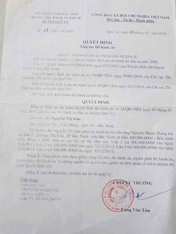 Tuy nhiên, khi chưa có Bản án, Quyết định có hiệu lức pháp luật của Tòa án, nhưng Chấp hành viên Chi cục thi hành án dân sự huyện Quế Võ lại “thần tốc” xử lý tài sản kê biên, bán đấu giá tài sản và giao tài sản trúng đấu giá cho bà Ngô Thúy Tình.