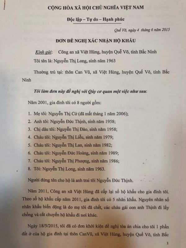 Phản ánh tới cơ quan báo chí, bà Nguyễn Thị Phượng người được bà Nguyễn Thị Long (cô ruột bà Phượng) ủy quyền cho biết; Hộ gia đình bà là chủ sử dụng thửa đất số 238, tờ bản đồ số 22, diện tích 624m2 tại thôn Can Vũ, xã Việt Hùng, huyện Quế Võ, tỉnh Bắc Ninh. Về nguồn gốc thửa đất là do ông bà nội để lại cho 8 thành viên trong gia đình. Năm 2001, UBND huyện Quế Võ đã cấp Giấy chứng nhận quyền sử dụng đất cho hộ gia đình. Thời điểm đó, người đứng tên chủ hộ là bố tôi Nguyễn Đức Thịnh.