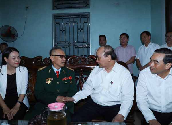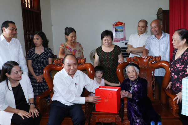 Trong chuyến công tác, Thủ tướng Nguyễn xuân Phúc thăm và tặng quà Bà mẹ Việt Nam Anh hùng Trần Thị Phi có 2 con là liệt sĩ tại xã Ninh Tiến, TP. Ninh Bình, tỉnh Ninh Bình. Ảnh: VGP/Quang Hiếu