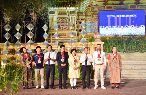 Chủ tịch UBND tỉnh Phan Ngọc Thọ và Bí thư Thành ủy Huỳnh Cư trao vòng vinh danh cho các nghệ nhân quốc tế tham dự Festival Nghề truyền thống Huế 2019.