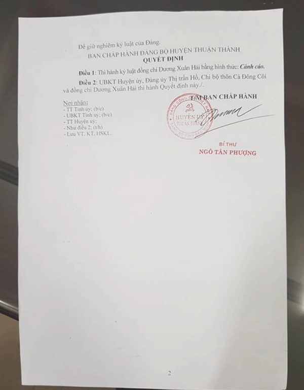 Với hàng loạt vi phạm như vậy, tuy nhiên, Huyện ủy Thuận Thành chỉ thi hành kỷ luật ông Hải bằng hình thức cảnh cáo, không mảy may suy suyển gì đến các chức vụ mà ông Hải đang nắm giữ.