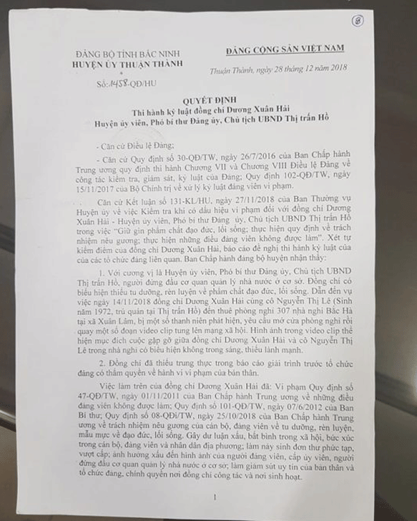 Như đã phản ánh, ngày 14/11/2018, ông Dương Xuân Hải bị phát hiện trong nhà nghỉ cùng bà Nguyễn Thị L. khi hai người đang ở phòng 307, nhà nghỉ Bắc Hà, xã Xuân Lâm, huyện Thuận Thành. Sau đó, ông Hải đã bị Huyện ủy Thuận Thành xử lý kỷ luật bằng hình thức cảnh cáo. Tuy nhiên, đến nay ông Hải vẫn “vững ghế” Huyện ủy viên, Chủ tịch UBND thị trấn Hồ.