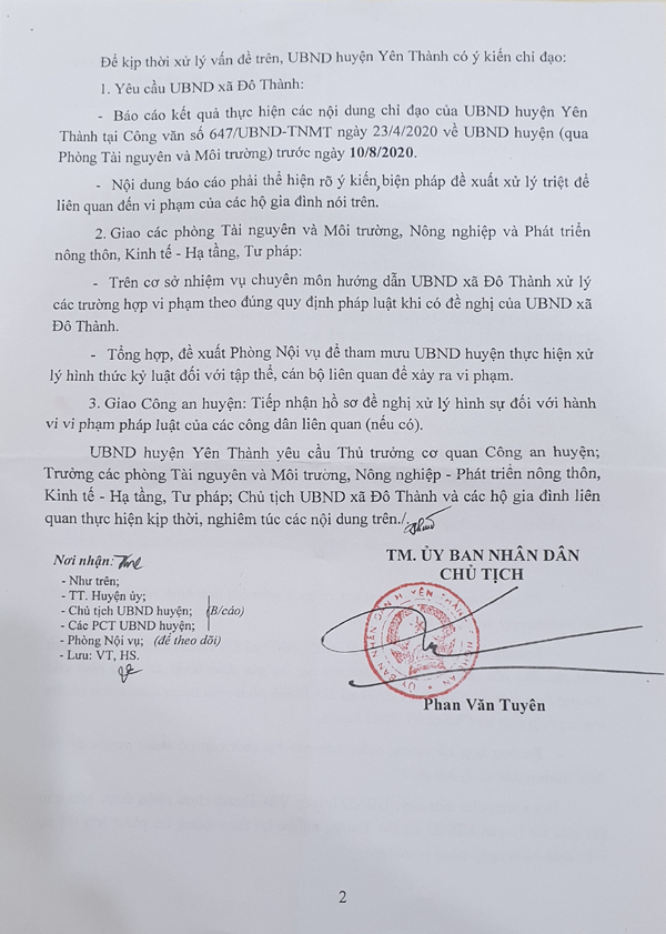 Theo đó, UBND huyện Yên Thành đã yêu cầu UBND xã Đô Thành: “tổ chức đình chỉ, chỉ đạo việc yêu cầu khắc phục đối với hộ gia đình có hành vi vi phạm. Thời hạn hoàn thành trước ngày 30/4/2020. Trường hợp hộ gia đình không chấp hành thực hiện, củng cố hồ sơ xử lý vi phạm hành chính, lập hồ sơ đề nghị thu hồi đối với phần diện tích vi phạm, xây dựng phương án cưỡng chế theo quy định pháp luật.