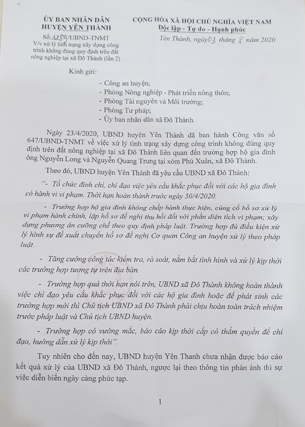 Ngày 03/8/2020, UBND huyện Yên Thành đã có Văn bản số 1289/UBND-TNMT về việc xử lý tình trạng xây dựng công trình không đúng quy định trên đất nông nghiệp tại xã Đô Thành (lần 2).