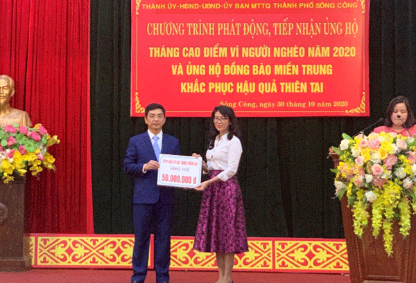 Ông Vũ Duy Nghĩa, Chủ tịch UBND Thành phố Sông Công nhận ủng hộ từ Bà Nguyễn Thị Thanh Trang, Phó Tổng Giám đốc Công ty CP Đầu tư Xây dựng Thiên Lộc, chủ đầu tư Khu đô thị Sông Công