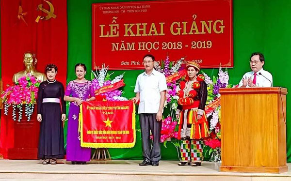 Ông Nguyễn Đình Quang, Phó Chủ tịch UBND tỉnh trao cờ đơn vị xuất sắc dẫn đầu phong trào thi đua năm học 2017-2018 cho trường Mầm non Sơn Phú (Na Hang).