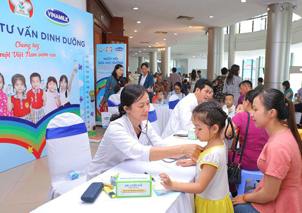 Các bác sĩ đến từ Trung tâm Tư vấn Dinh dưỡng Vinamilk khám và tư vấn dinh dưỡng cho các em học sinh tại Ngày hội SHĐ Đà Nẵng.