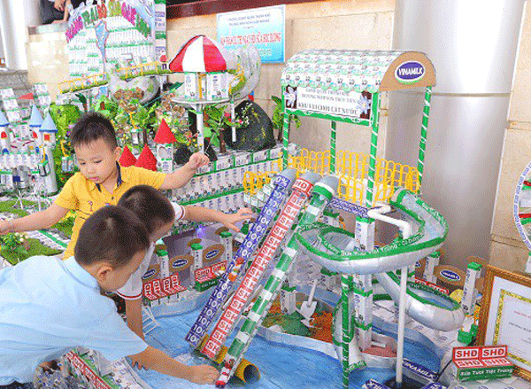Phụ huynh học sinh và các em nhỏ thích thú xem các đồ dùng, đồ chơi, mô hình từ vỏ hộp sữa đã qua sử dụng tại Ngày hội SHĐ Đà Nẵng.