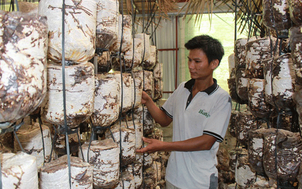 Mô hình trồng nấm sò, mộc nhĩ, linh chi của anh Nguyễn Hoàng Sơn, thôn Trần Phú, xã Nhân Đạo (Sông Lô) cho thu lãi hơn 100 triệu đồng/năm. Ảnh Hoàng Long