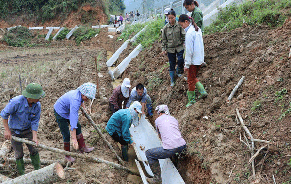 Người dân xã Sơn Phú, huyện Na Hang (Tuyên Quang) đang lắp đặt kênh mương đúc sẵn do Công ty TNHH Đầu tư và Xây dựng Thành Hưng cung ứng.