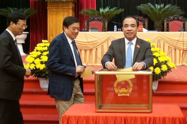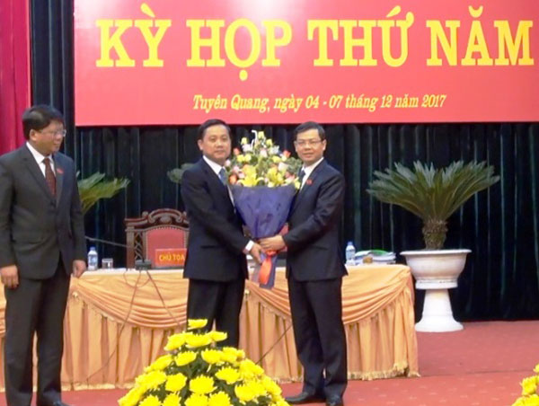 Tân Phó Chủ tịch UBND tỉnh Tuyên Quang khóa XVIII, nhiệm kỳ 2016 - 2021 Nguyễn Thế Giang (giữa) nhận hoa chúc mừng.