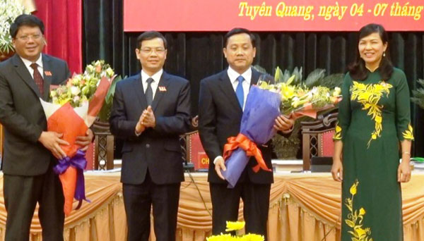 Tân Phó Chủ tịch UBND tỉnh Nguyễn Thế Giang (thứ hai từ phải sang) và tân Uỷ viên UBND tỉnh Hà Trung Kiên (ngoài cùng bên trái) ra mắt HĐND tỉnh Tuyên Quang