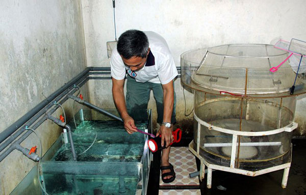 Cán bộ trung tâm đang kiểm tra cá chiên bố, mẹ trước khi cho sinh sản nhân tạo tại Trung tâm Thủy sản tỉnh Tuyên Quang