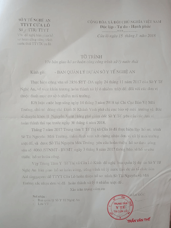 Cụ thể tại Trung tâm Y tế TX Cửa Lò, do chưa được bàn giao hồ sơ nên đến nay, đơn vị này vẫn chưa được xác nhận “đơn vị đã hoàn thành xử lý ô nhiễm triệt để”. Ngày 15/3/2018 vừa qua, Trung tâm Y tế TX Cửa Lò đã có công văn yêu cầu bàn giao hồ sơ hoàn công công trình xử lý nước thải để được Sở TN&MT Nghệ An xác nhận, tuy nhiên đến nay, đơn vị này vẫn chưa nhận được bất kỳ giấy tờ, hồ sơ nào từ phía BQL dự án Sở Y tế Nghệ An.