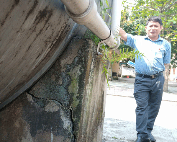 Tại hệ thống xử lý nước thải Trung tâm Y tế TX Cửa Lò có giá trị khoảng 3 tỉ đồng đã xuất hiện nhiều vết nứt trên thân bồn cũng như trụ đỡ. Với khối lượng hàng chục tấn, nếu không được sửa chữa kịp thời, các bể chứa chất thải này có thể bục vỡ hết sức nguy hiểm.