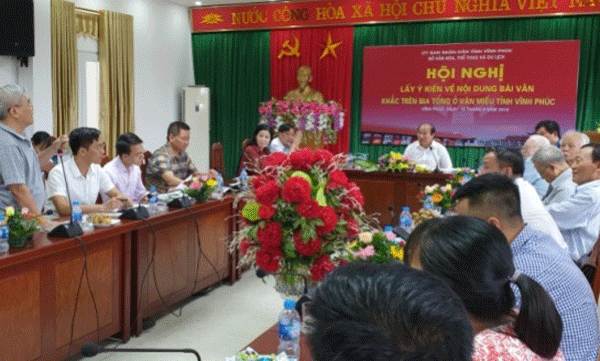 Ông Trần Ngọc Oanh cho biết thêm: Trước đây, Sở Văn hoá, Thể thao và Du lịch tỉnh Vĩnh Phúc đã lấy 2 ý kiến các nhà khoa học về nội dung bài văn bia tổng tại Văn miếu, trên cơ sở nội dung góp ý của các nhà khoa học, Sở đã tiến hành chỉnh sửa, hoàn thiện nội dung, hình thức trình bày. Tuy nhiên, để xây dụng bia tổng Văn miếu đảm bảo tính khoa học, chặt chẽ, chính xác, phù hợp với truyền thống. Hôm nay, Sở Văn hoá Thê thao và Du lịch tỉnh Vĩnh Phúc tổ chức Hội nghị lấy ý kiến lần cuối về nội dung bài văn bia tổng trước khi tiến hành dựng bia trên thực địa.