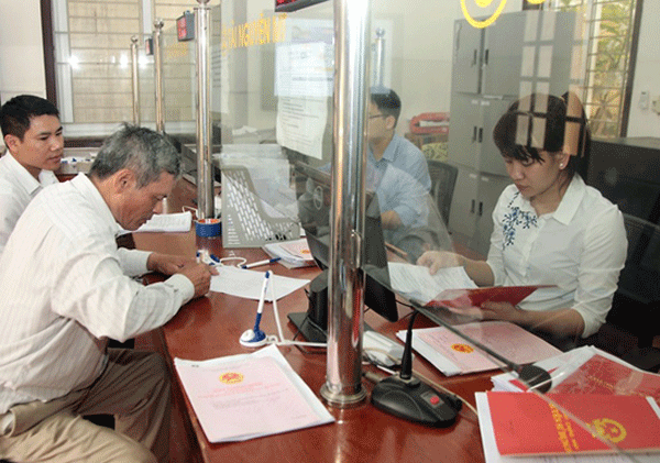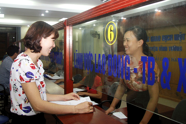 Cán bộ bộ phận "một cửa" UBND huyện Vĩnh Tường giải quyết công việc trên cơ sở phân cấp trách nhiệm rõ ràng, công khai, minh bạch. Ảnh Dương Hà