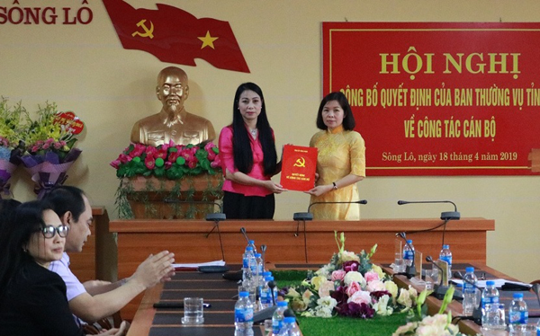 Trao quyết định và tặng hoa chúc mừng Bí thư huyện ủy Sông Lô Phùng Thị Kim Nga, đồng chí Bí thư Tỉnh ủy Hoàng Thị Thúy Lan mong muốn đồng chí Phùng Thị Kim Nga trên cương vị công tác mới phát huy tinh thần trách nhiệm và kinh nghiệm công tác, hoàn thành xuất sắc nhiệm vụ được giao.