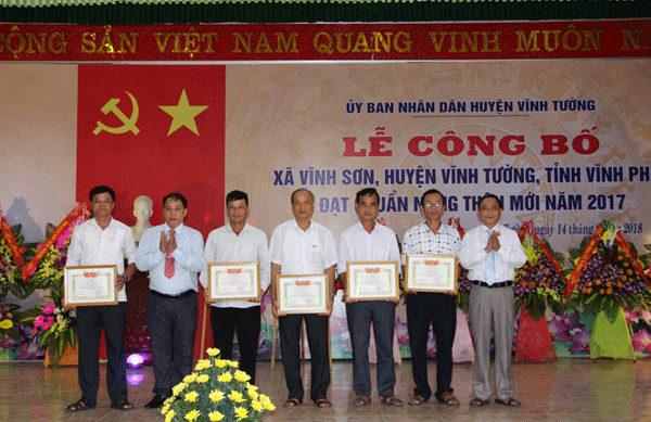 Chủ tịch UBND tỉnh Vĩnh Phúc - Nguyễn Văn Trì trao Quyết định và Bằng công nhận đạt chuẩn nông thôn mới năm 2017 cho Đảng bộ, chính quyền và nhân dân xã Vĩnh Sơn.