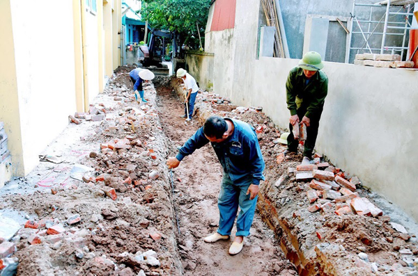 Người dân thôn Chung, xã Ngũ Kiên hưởng ứng phong trào xây dựng cống, rãnh thoát nước thải trong khu dân cư, góp phần khắc phục ô nhiễm môi trường. Ảnh: Trà Hương