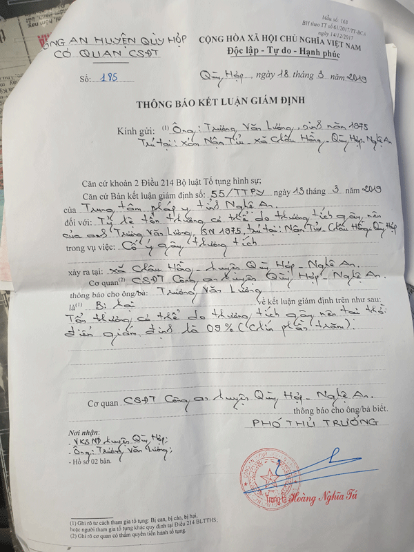 Cũng theo ông Lương, hiện tôi đã nhận được kết quả mức độ tổn hại sức khỏe của mình nhưng "tôi không đồng ý với kết quả này và đã viết đơn xin giám định lại”.