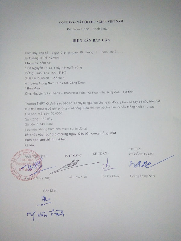 Biên bản bán 152 cây giữa nhà trường và ông Thành (người mua cây) đang đá trách nhiệm cho nhau.