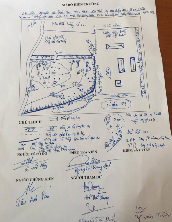 Sơ đồ hiện trường đất và cây ông Huân được các cơ quan chức năng đo vẽ tại hiện trường