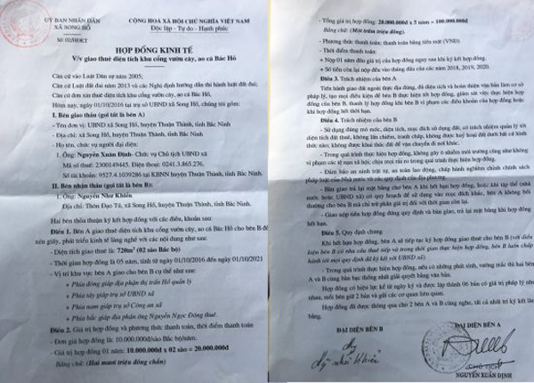 Qua xem xét các giấy tờ ông Định cung cấp, luật sư Nguyễn Quang Tâm, Đoàn Luật sư Hà Nội cho rằng, có những điểm rất bất thường. Đó là cùng ngày 1/10/2016, bên cạnh việc UBND xã Song Hồ ký hợp đồng cho thuê thầu đất với ông Đông thì UBND xã Song Hồ còn ký tiếp một hợp đồng cho thuê đất với ông Khiển. Theo đó, ông Khiển được thuê 2 sào đất khu cổng vườn cây ao cá Bác Hồ để “cắt xén giấy, phát triển kinh tế làng nghề”, thời gian thuê cũng là 5 năm, từ ngày 1/10/2016 đến ngày 1/10/2021.