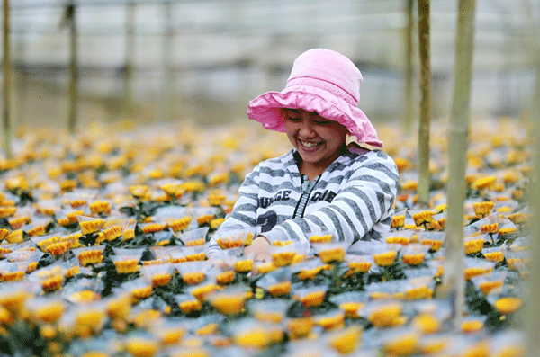 Nông dân chăm sóc hoa cúc để xuất khẩu sang Nhật Bản